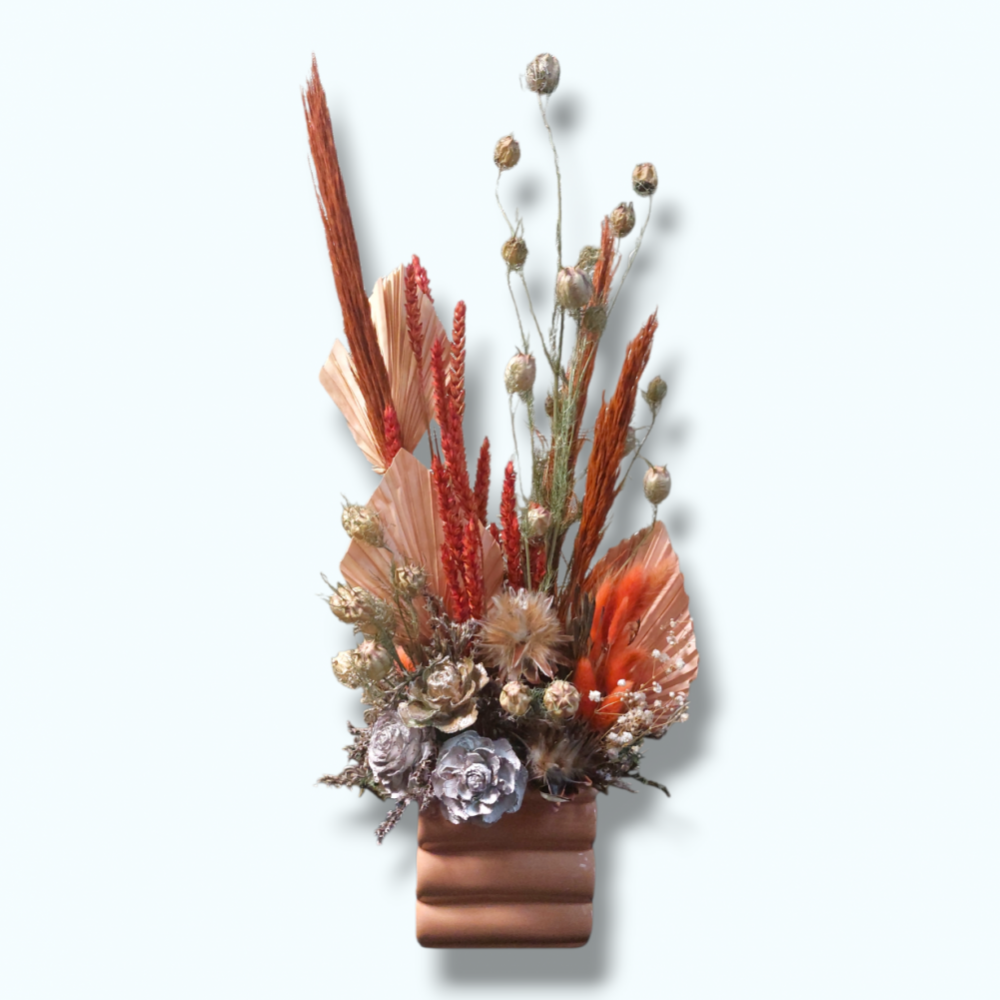 lovely dried arrangement in shades of peaches and coral. This naturalistic arrangement of dried flowers and botanicals makes a lovely long lasting gift for somebody special.