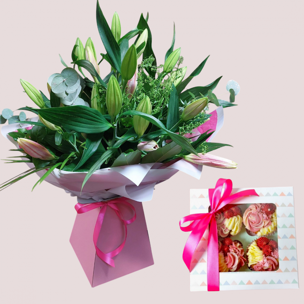 Mothers Day Lily Bouquet and Box of 4 Cupcakes - A beautiful hand-tied bouquet of mixed Lilies curated by John Paul and teamed with local grown Irish seasonal foliages. Your Mothers Day Lily bouquet will be aqua-packed in water for extra freshness and presented in a gift box or bag for delivery. Teamed with a box of four beautiful hand baked cupcakes that tastes as good as they look. Baked with love by our neighbours Crann Beatha Cafe