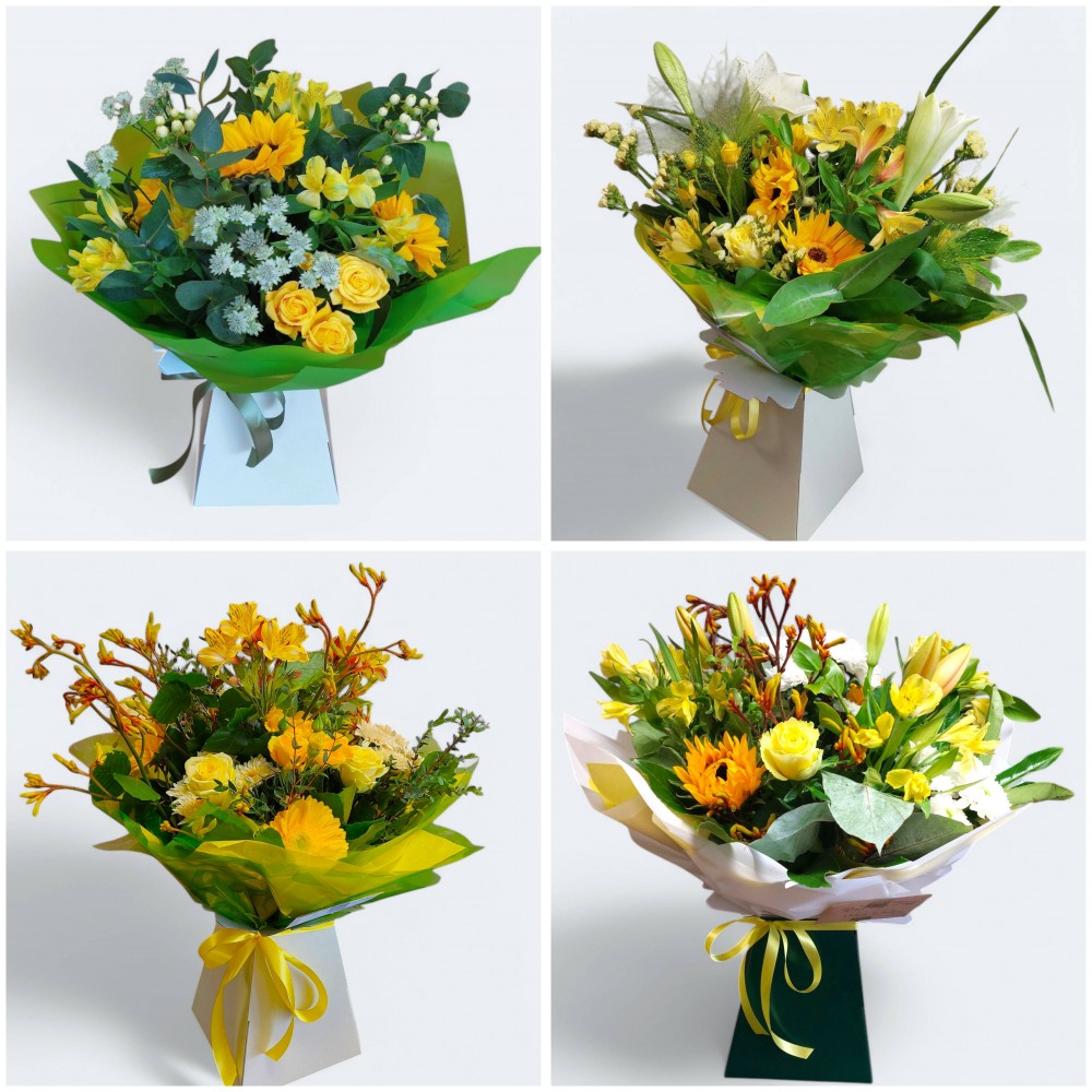 A hand-tied gift bouquet in warm sunshine colours. The bouquet will be created in the florists choice of fresh flowers and seasonal foliages. Bouquet will be aqua-packed in water for extra freshness and delivered in a presentation box or bag.